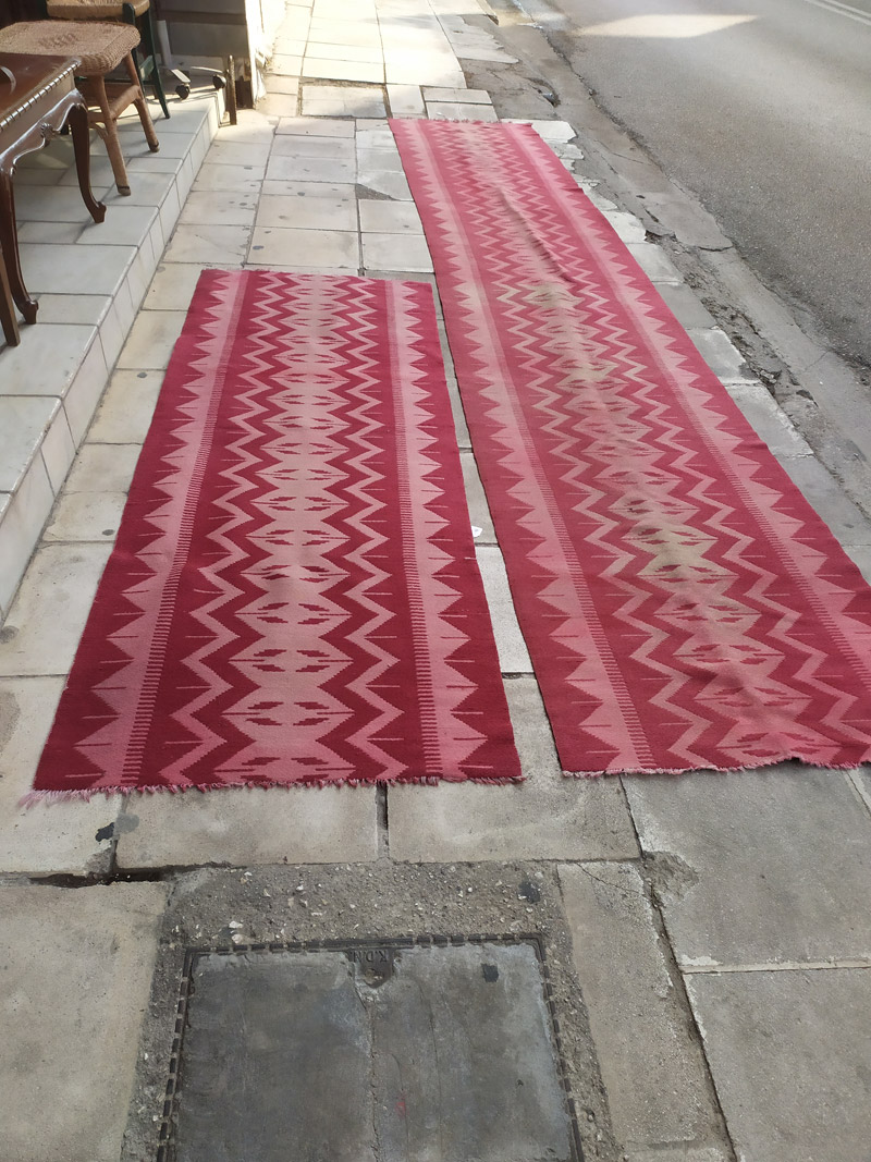 μικρό: 2.20*0.80μεγάλο: 4.40*0.80υφαντά, μάλλινα, σε πολύ καλή κατάσταση.