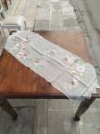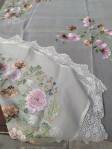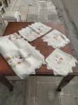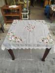ένα τεμ.τετράγωνο: 1,30*1,30μένα τεμ.τραβέρσα: 0,44*1,20μδύο τεμ.τετράγωνα καρέ: 0,54*0,54μμεταξωτά χειροποίητα εργόχειρα